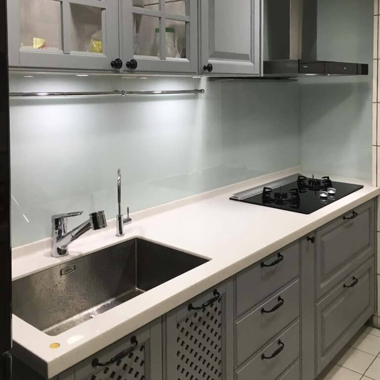 廚房與浴室通常是房屋改裝最常要求的項目,這次廚房部分,主人把已經老舊的系統廚具換掉,換成最喜歡的鄉村風廚具,這也是很多客人喜歡的風格,當然這是鼎盛嘉最擅長的,這次為客人搭配了Grace格麗斯實木廚具,滿滿鄉村風設計,類深鐵灰色的設計,讓整個空間更為沈穩,選擇較深的顏色,看起來也比較不顯髒,除了滿滿的櫥櫃,裏頭瓶罐的置物架這次也依照需求設計進去,龍頭部份選用了可伸縮的龍頭,方便洗滌,旁邊也搭配了一個櫥下型淨水器,不論飲用或一般洗滌都很方便,淨水器也是現在很多家庭在設計廚具,都會規劃進去,當然最重要是,要記得在櫥櫃拉上電源插座,以作未來裝設淨水器或洗碗機使用。