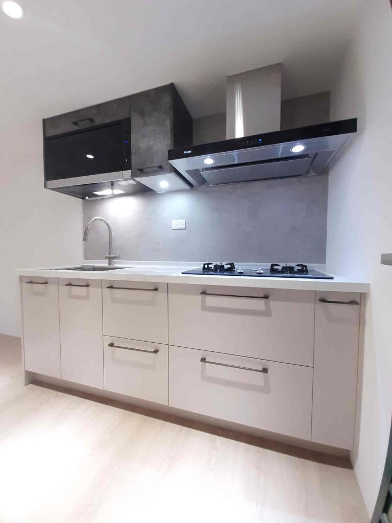 :櫃體選擇塑合板,運用單色表現,展現和紙恬靜質感,運用黑色把手,做對比反差點綴,上櫃與防濺板採用同樣為灰色的設計,加入質樸簡約相呼輝映,帶出都會現代簡約風格。