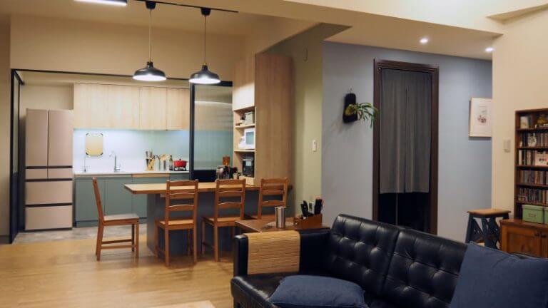 ● 因為現在的房子,很多都是做開放式廚房,業主本身偶會下廚,所以希望能做可移動式的輕隔門,一方面在烹飪時,可以阻斷油煙,也因為空間一打開大門就正面對廚房,做個輕隔門,也可以避免開門見灶,業主在隔門材質上選擇用長虹玻璃,也帶了點復古風格點綴其中